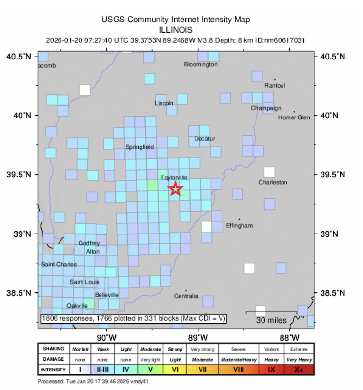 The U.S. Geological Survey confirmed a 3.8 magnitude earthquake happened at 1:27 a.m., about 5.5 miles underground near Ohlman, which is about 90 miles northeast of St. Louis.