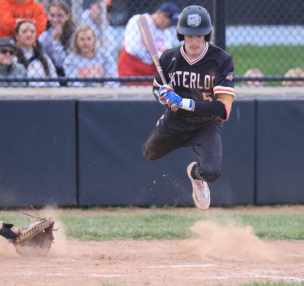 Waterloo’s Drake Luedeman leaps out of the way to avoid being hit by a pitch during last Tuesday’s home win over O’Fallon. See more photos online at republictimes.smugmug.com.