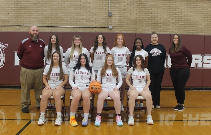 Pictured is the Dupo High School girls basketball squad for the 2025-26 season, front row, from left: Lily McMannis, Addison Mitchell, Maryann Imhoff and Shaylee Messersmith; back row: Coach Carpenter, Kaitlyn Roberts, Rebecca Esser, Keara Prater, Kylie Kloess, Demiyah Chairs, Olivia Reichling and Coach Brumit.