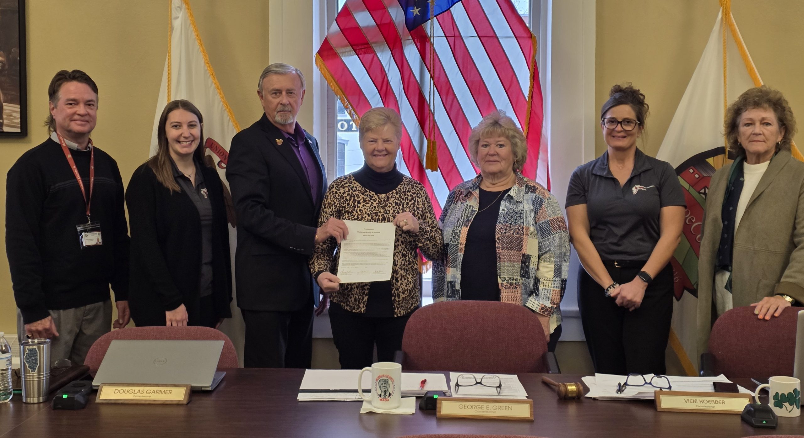 Members of the Monroe County Farm Bureau were on hand during the Monroe County Board meeting on March 16. Chairman George Green read a proclamation for National Ag Day on March 24. Pictured, from left, are Commissioner Doug Garmer, Farm Bureau Manager Erin Dierkes, Green, Farm Bureau members Cindy Ruemker, Gale Mueller and Anna Guebert with Commissioner Vicki Koerber.
