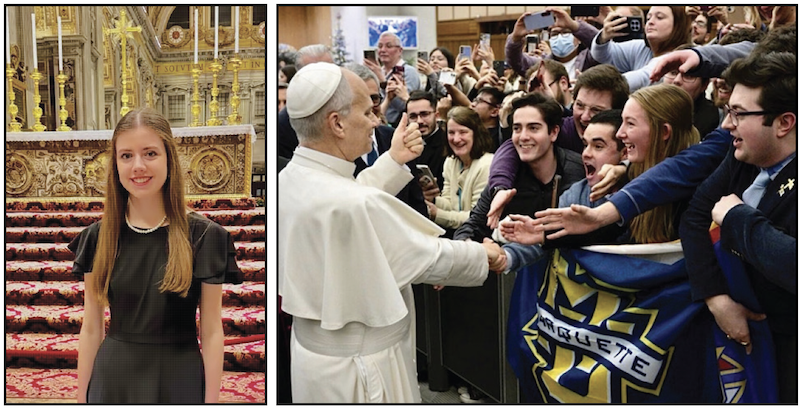 At left is Alexa Crowe inside St. Peter’s Basilica in Rome. At right, Brennan Wills is about to shake hands with Pope Leo XIV.
