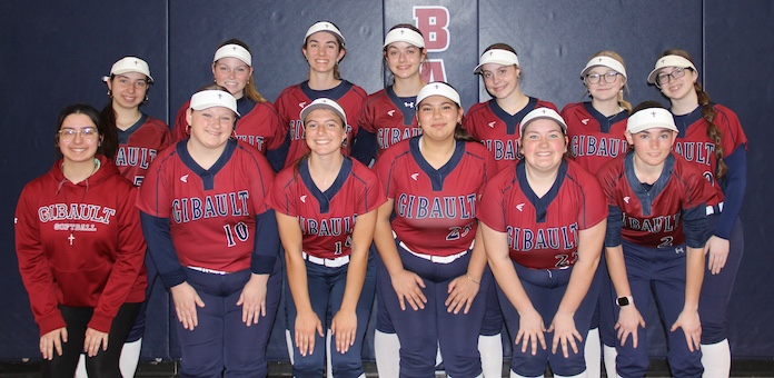 Pictured is the 2026 Gibault Catholic High School softball squad, front row, from left, Kaila Jerkatis (manager), Chloe Lancaster, Sophie Winkeler, Kylie Edwin, Claire Schuchardt and Abby Kunkelmann; back row: Karina Jerkatis, Hope Chambers, Claire Kessler, Grace Kessler, Kennedy Cooper, Molly Steibel and Lauren Lanham.