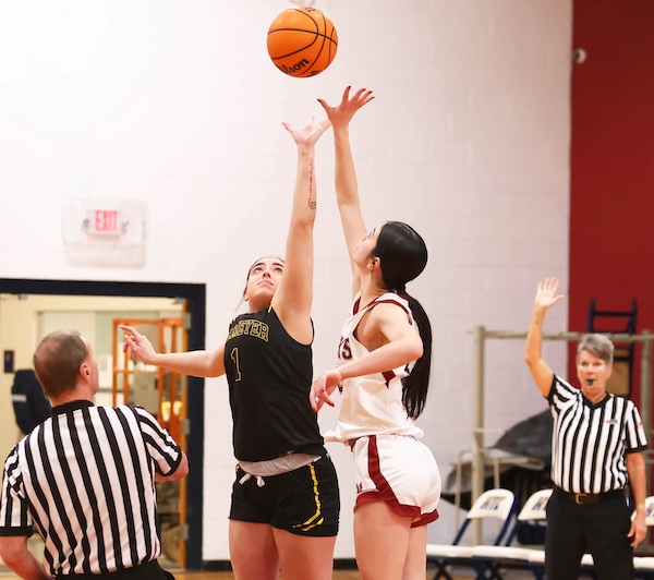 Kaleigh Hicks (1) of Valmeyer and Karmon Grohmann (12) of Gibault jump for the opening tip in a non conference girls basketball game at Gibault Catholic High School in Waterloo, Illinois on Tuesday January 20; 2026. Paul Baillargeon