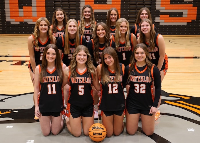 Pictured is the Waterloo High School girls basketball squad for the 2025-26 campaign, front row, from left, Kenley Mueller, Nichole Gum, Kenzie Nordike and Tess Nobbe; middle row: Addy Juelfs, Aubrey Heck, Mallory Thompson, Paige Lindhorst and Jessica Richter; back row: Calla Espenschied, Addie Stell, Sam Juelfs and Katherine Otten.