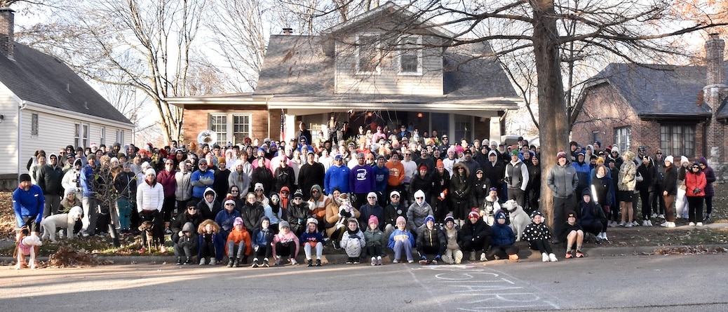 Pictured is the crowd in front of the Rau household in Waterloo on Thanksgiving, bundled up for the cold but happy to run the annual charity Rau-athon.
