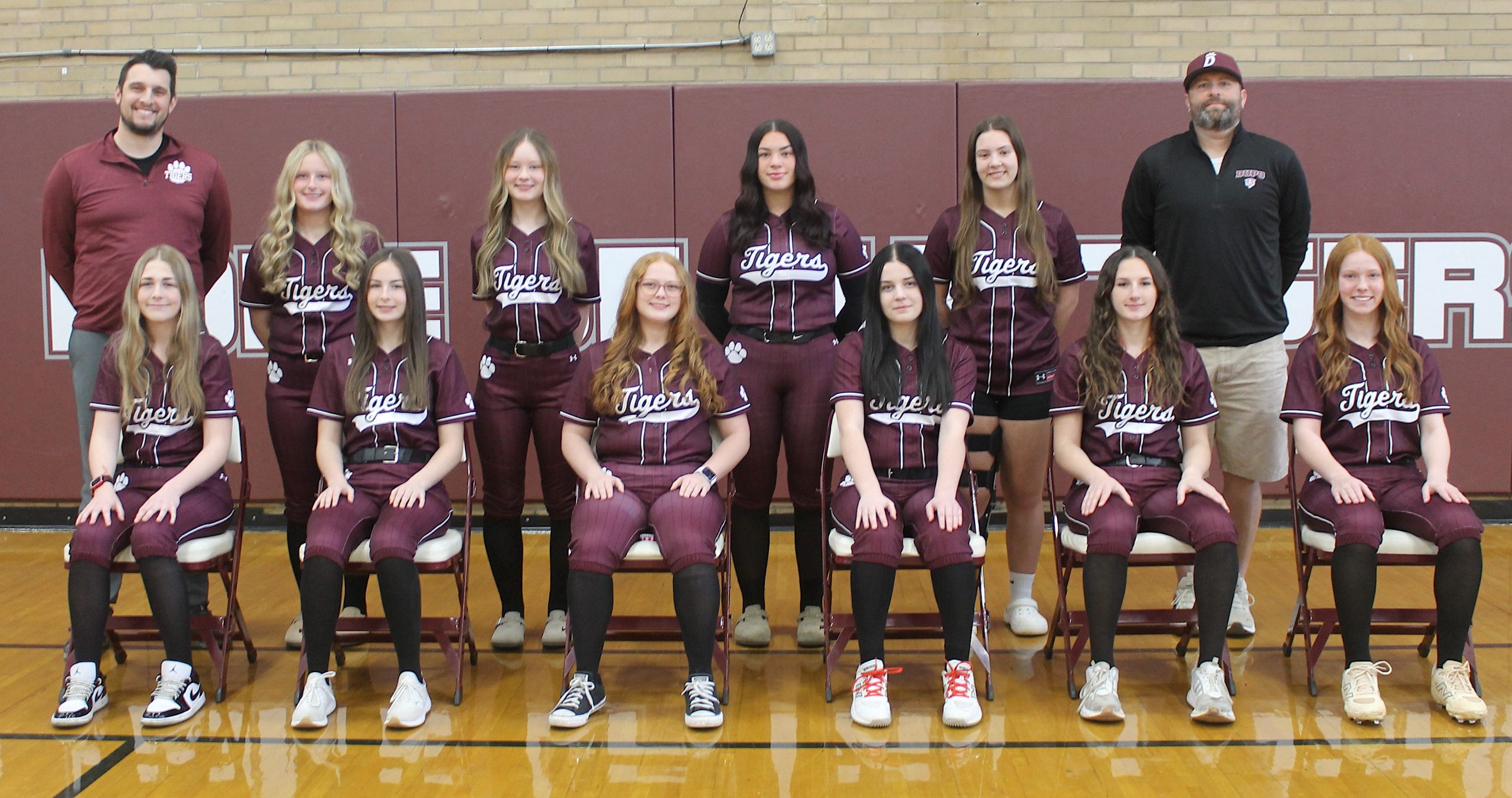 Pictured is the 2026 Dupo High School softball squad, front row, from left, Erica Touchette, Kaitlyn Roberts, Maryanne Imhoff, Chloe Thornton, Keara Prater and Kylie Kloess; back row: Coach Hempen, Addison Thompson, Kylie Pierce, Addison Mitchell, Lilianna McMannis and Coach Czapla.