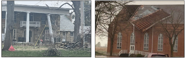 Pictured is damage from two confirmed Sunday evening tornadoes in this area. At left is damage from an EF-1 tornado that touched down in New Athens. At right is damage  to the roof of Trinity Lutheran Church southeast of Red Bud due to an EF-0 tornado.