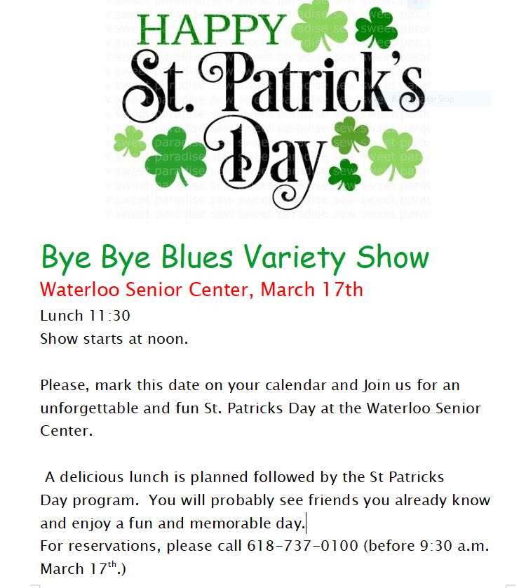 Bye Bye Blues Variety Show (with local entertainers) Waterloo Senior Center, March 17 (St. Patricks Day) Lunch at 11:30 Show starts at noon For reservations please call 618 737 0100 before 9:30 am March 17th |